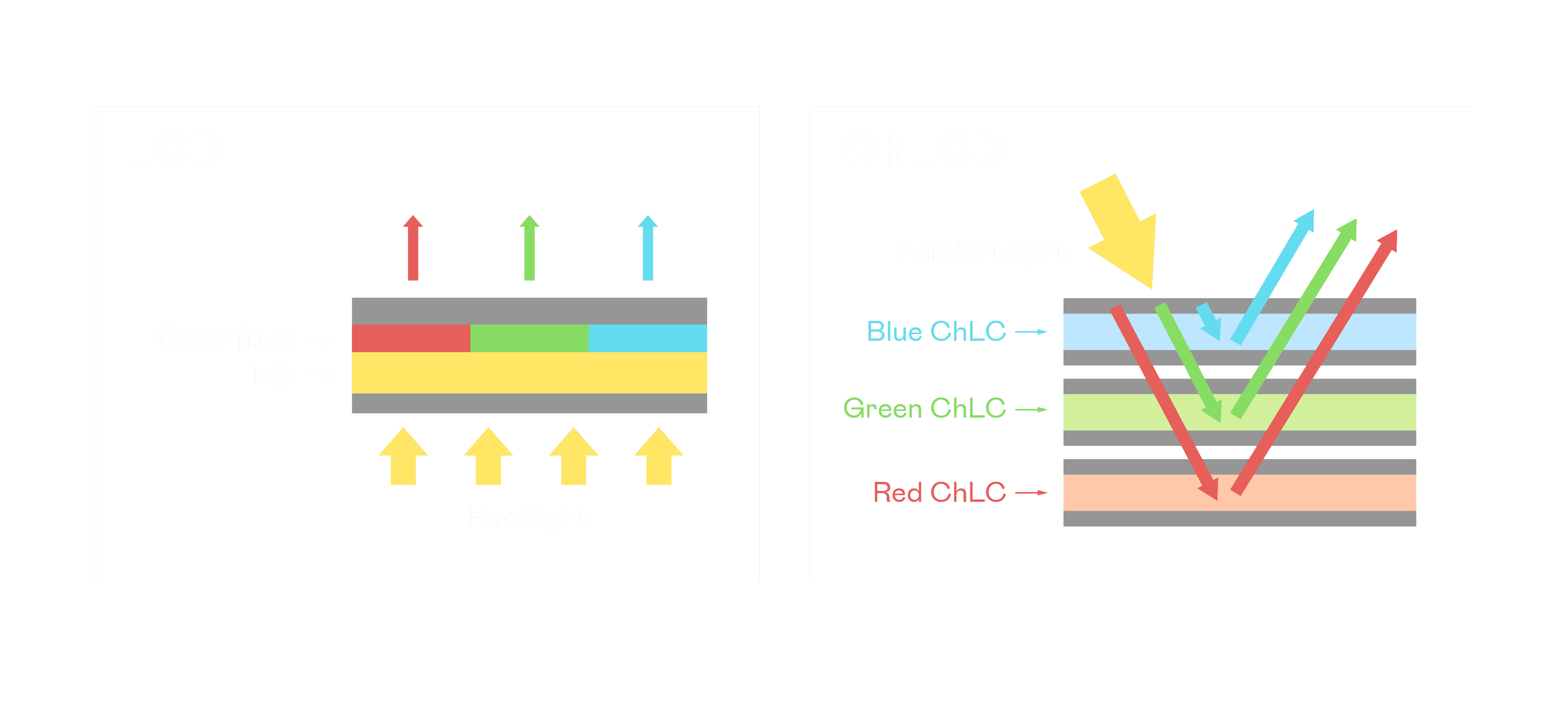 壹号平台胆固醇液晶显示器是由红、、、绿、、、蓝三层胆固醇液晶面板堆叠而成,,,并采用无彩色滤光片设计,,,减少环境光在反射过程中的损耗。。