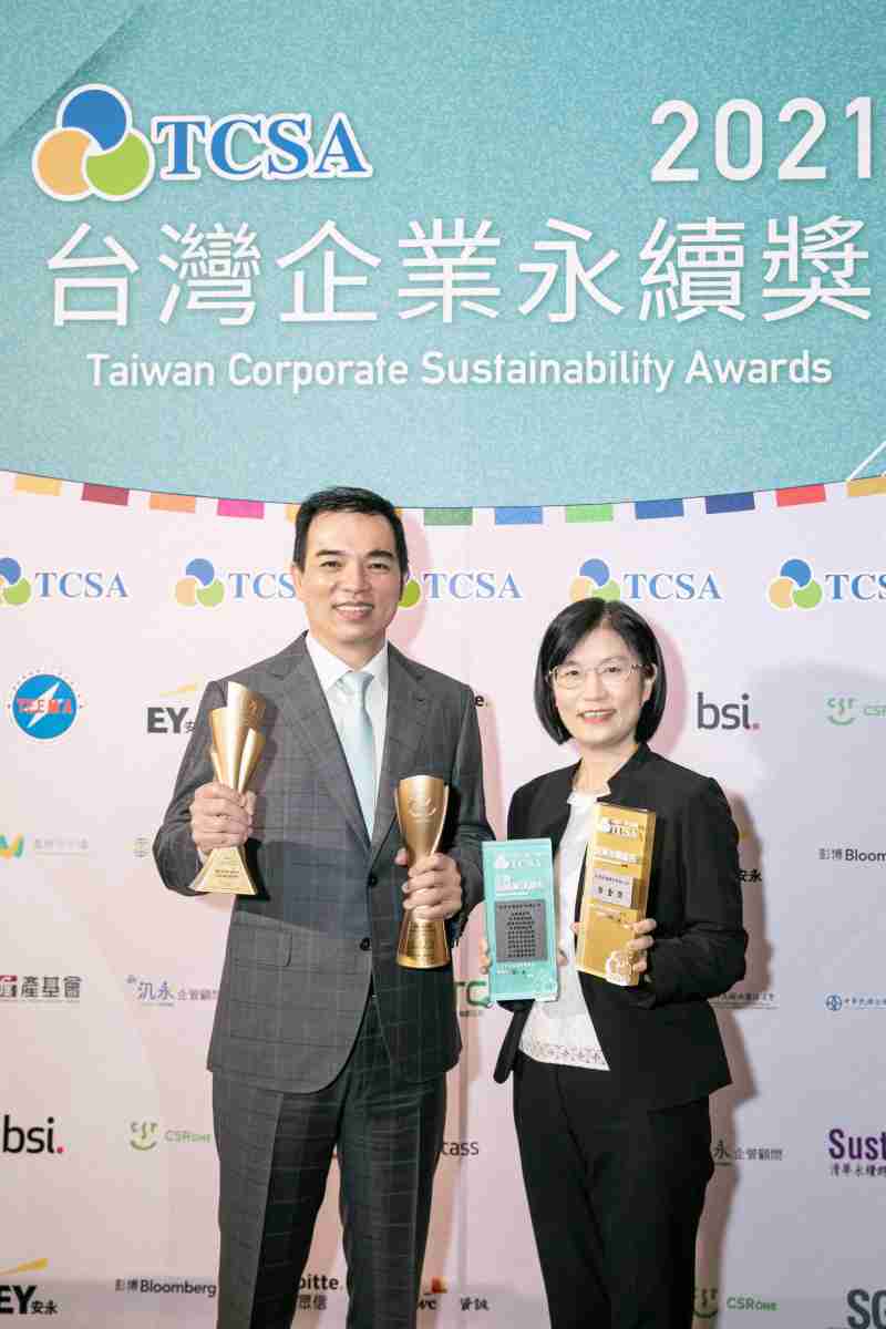 达在台湾永续奖所评比环境、、、社会、、治理等各面向的永续绩效均获高度肯定 (左:壹号平台光电总经理暨营运长柯富仁,,,右:壹号平台光电永续长古秀华)