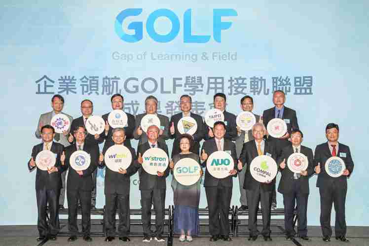GOLF学用接轨联盟集结企业和学校的力量,,打造「学用合一、、、、产学接轨」的创新合作平台 (前排左起:淡江大学副校长何启东、、元智大学校长林启瑞、、纬育执行长许延岳、、纬创总经理暨执行长黄柏漙、、教育部政务次长范巽绿、、、壹号平台董事长暨执行长彭双浪、、、仁宝总经理暨执行长翁宗斌、、大同大学校长何明果、、、圣约翰科大校长艾和昌;后排左起:明新科大校长林启瑞、、、龙华科大校长葛自祥、、台湾科大校长廖庆荣、、、中兴大学副校长郑政峯、、、中央大学校长周景扬、、、台北科大副校长任贻均、、、中华科大副校长石大明、、、明志科大校长刘祖华)